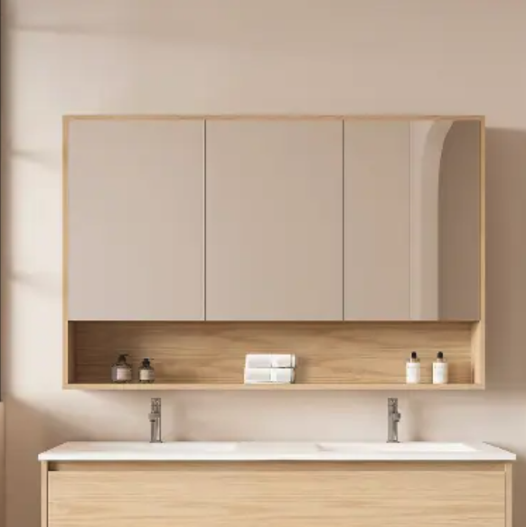 Three Mirrored Doors – Clear and functional mirrors with concealed storage.
